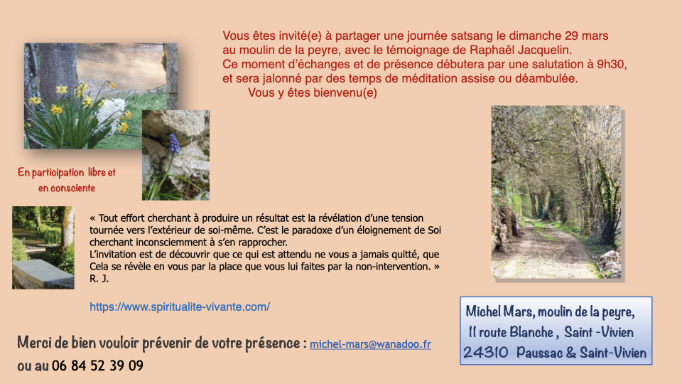 Nous partagerons pendant cette journée une manière de s’y prendre à partir de votre expérience. Nul débat d’idées ou de concepts, mais une approche et une compréhension de ce dont il s’agit très concrète puisque par l’expérience vécue.